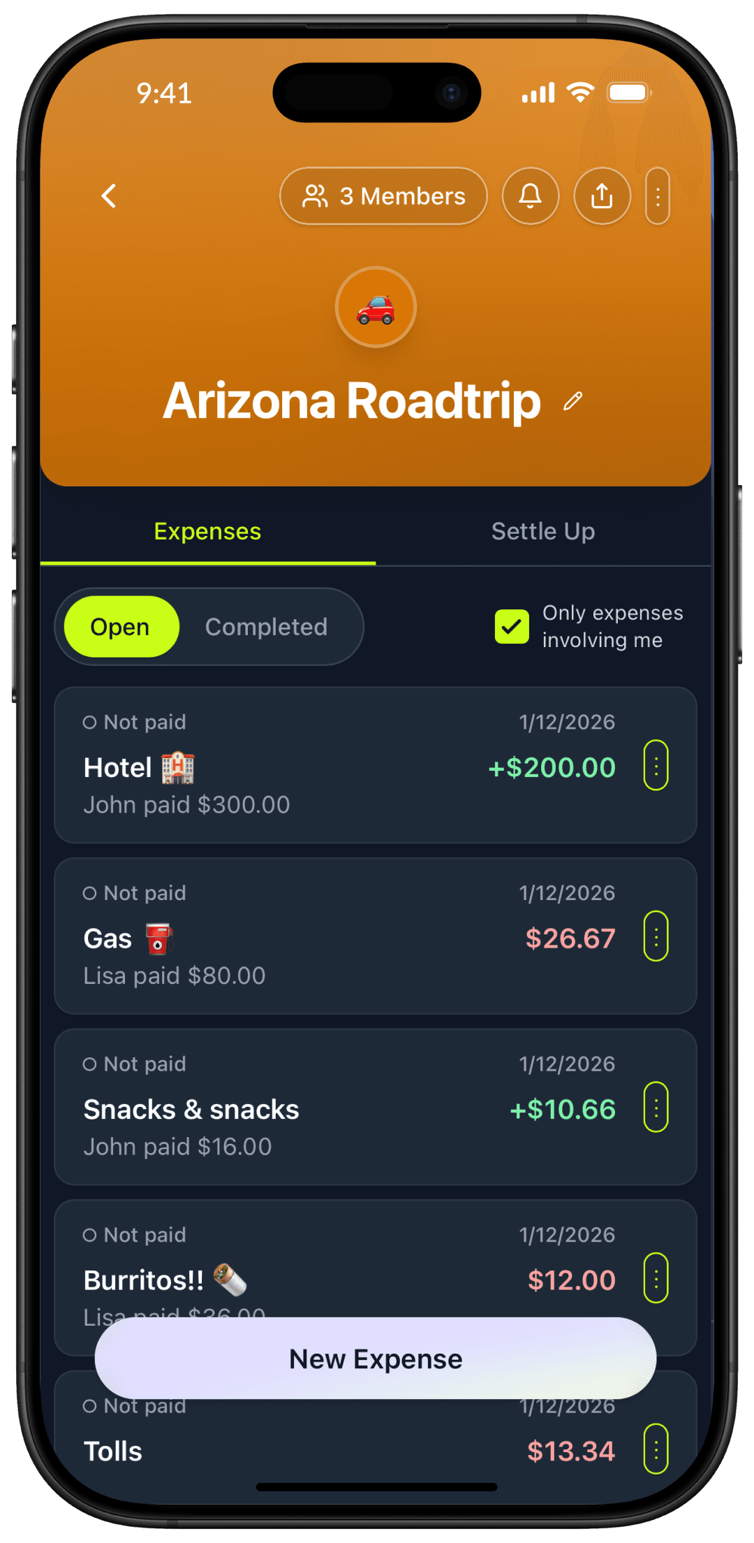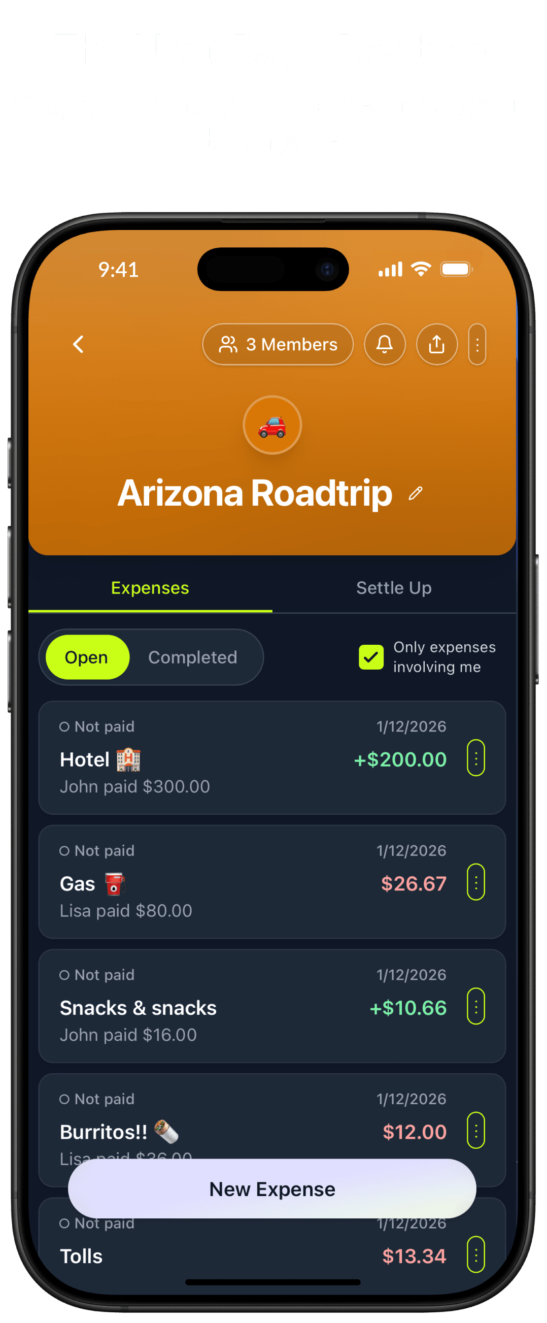 Gas, tolls, snacks... All added to a group by anyone.